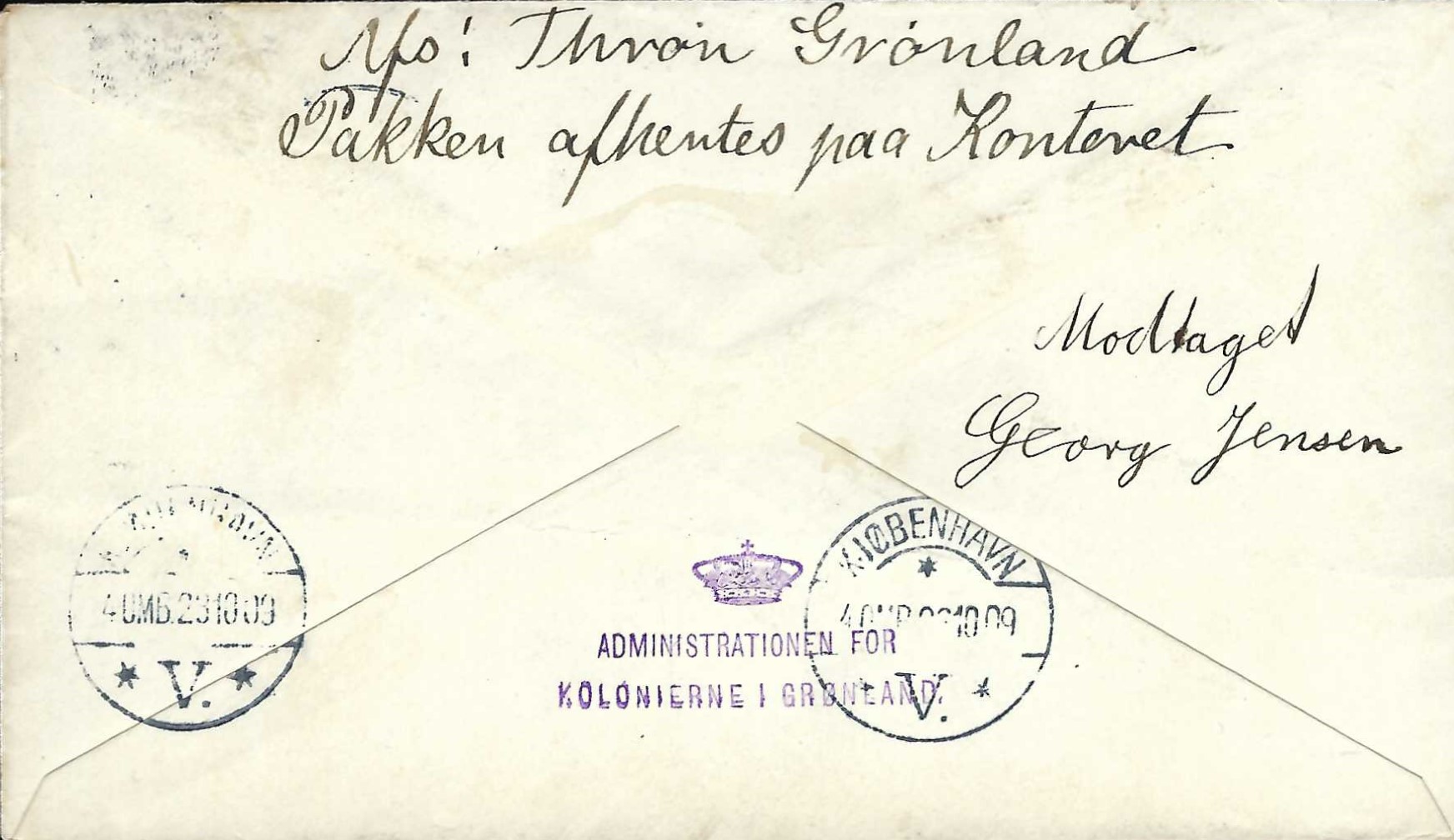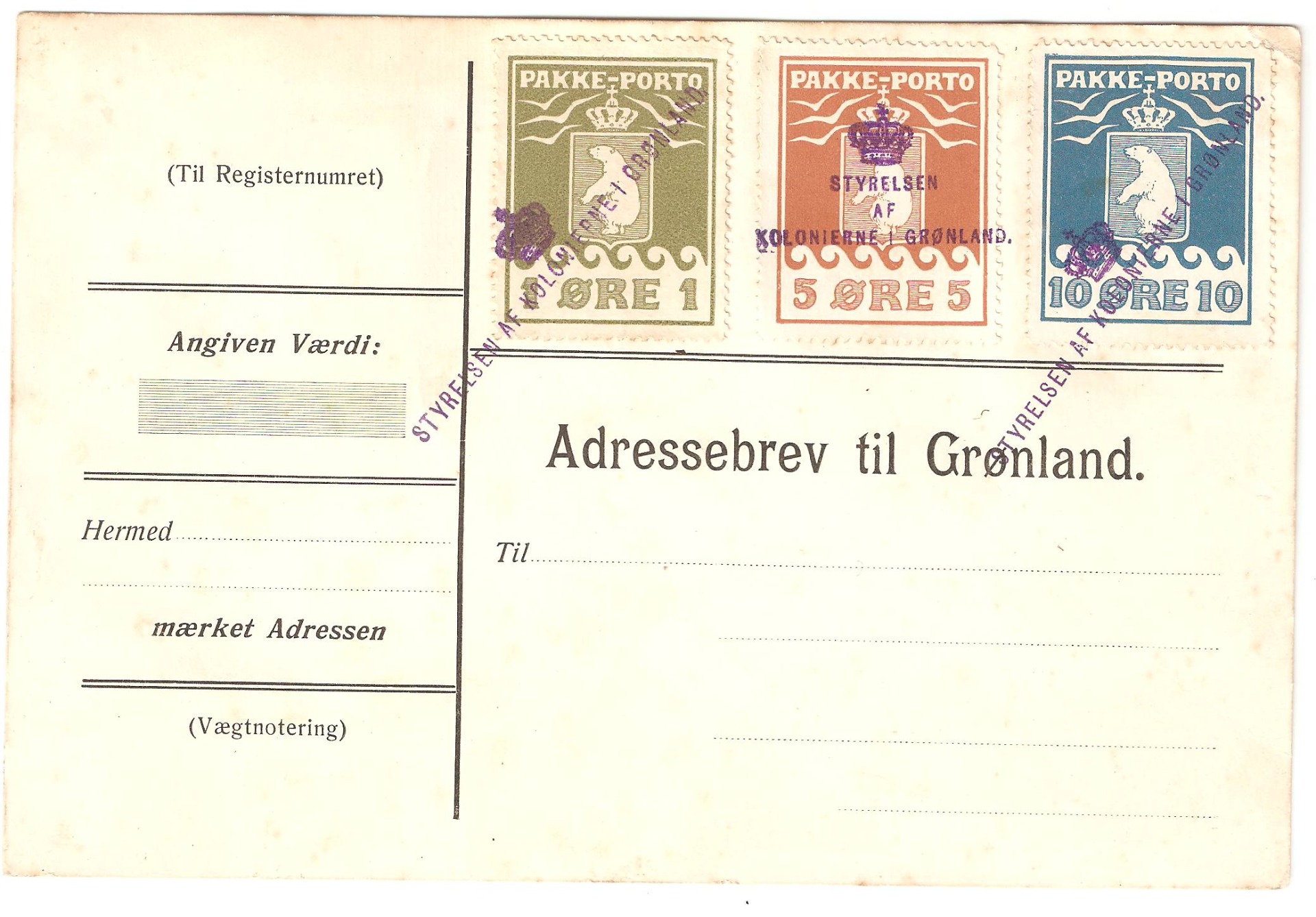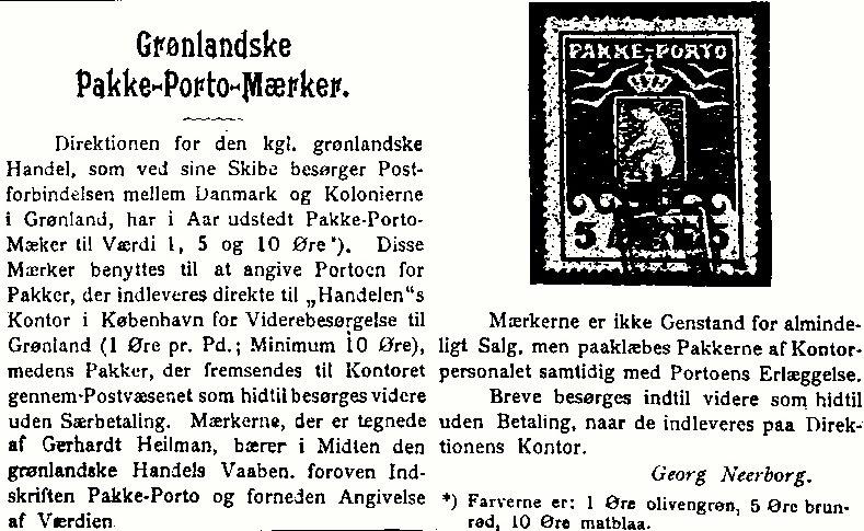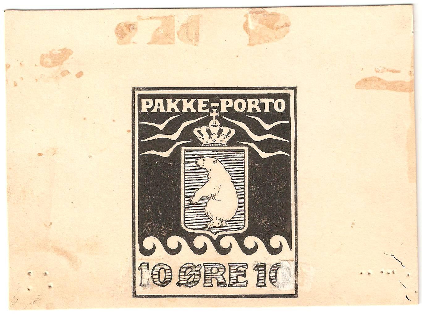 Pakkeportomærket kom i brug på adressekort (fra 1909) mellem KGH i København og postste-der i Grønland. Takst var 10 øre, op til 5 Kg. plus 1 øre per ½ Kg. Med tillægstaksen fra 1930 blev portoforholdene ændret (fra 110 øre) til endog mere end en 10 dobling, samtidig med godken-delse af pakkeporto.