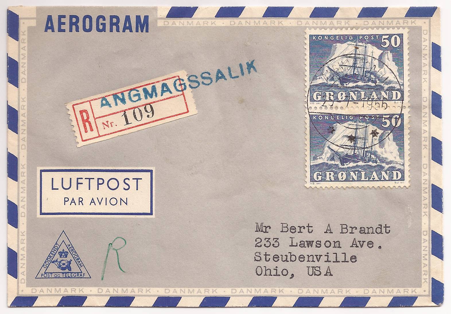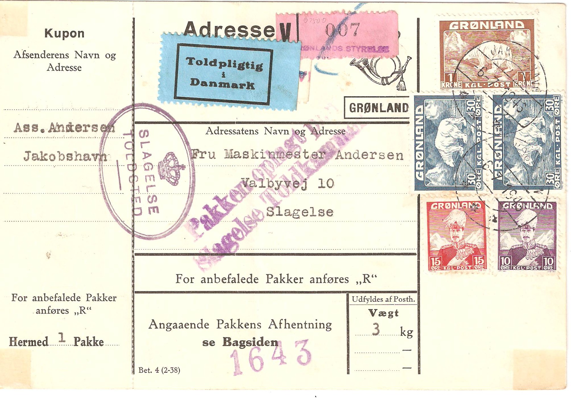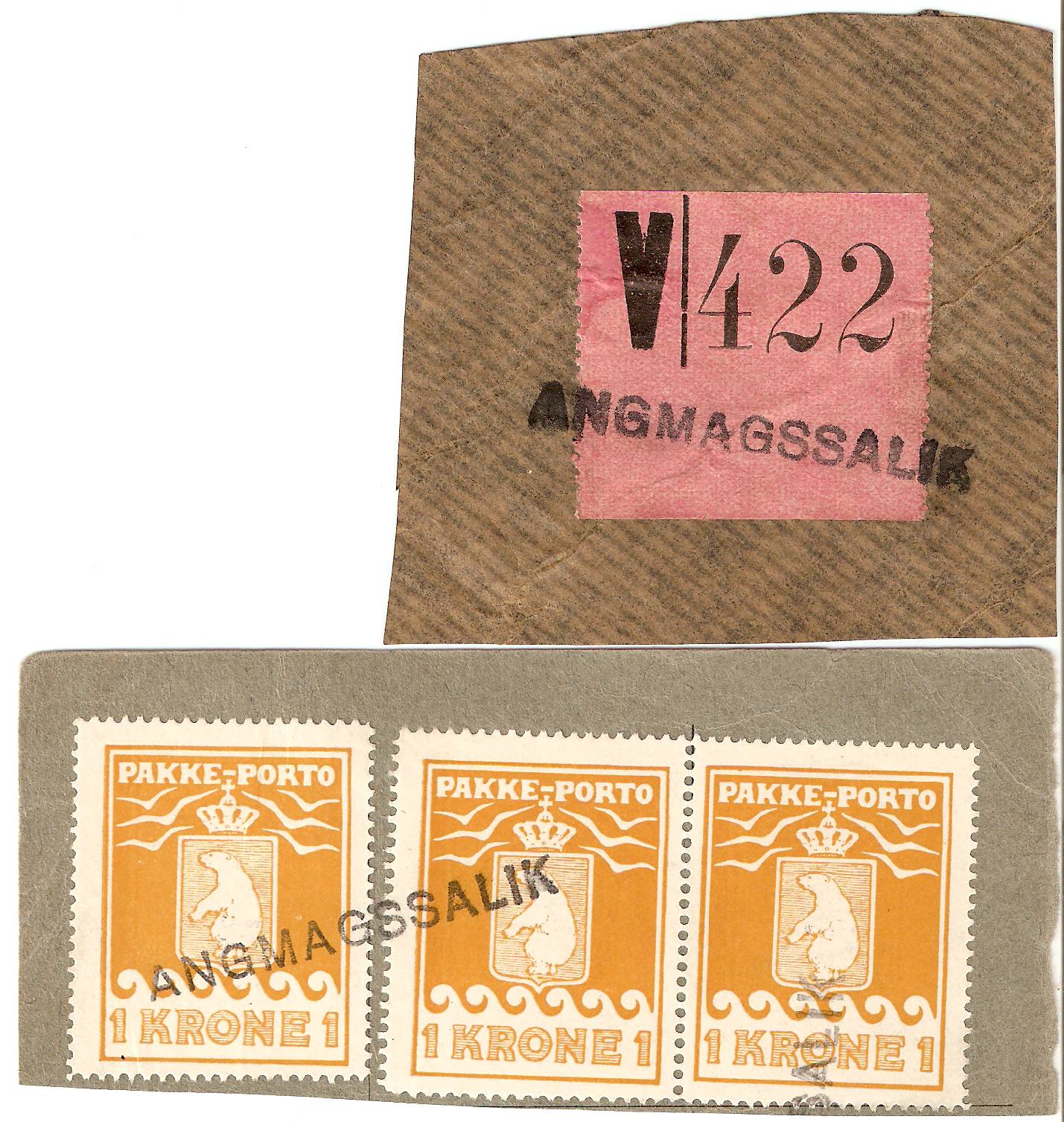 Angmagssalik 1-linie stempel benyttet på num-meretiket, på R-brev og fiskalt på pakkeporto-mærke. Derimod er postal brug ukendt på pak-keporto.