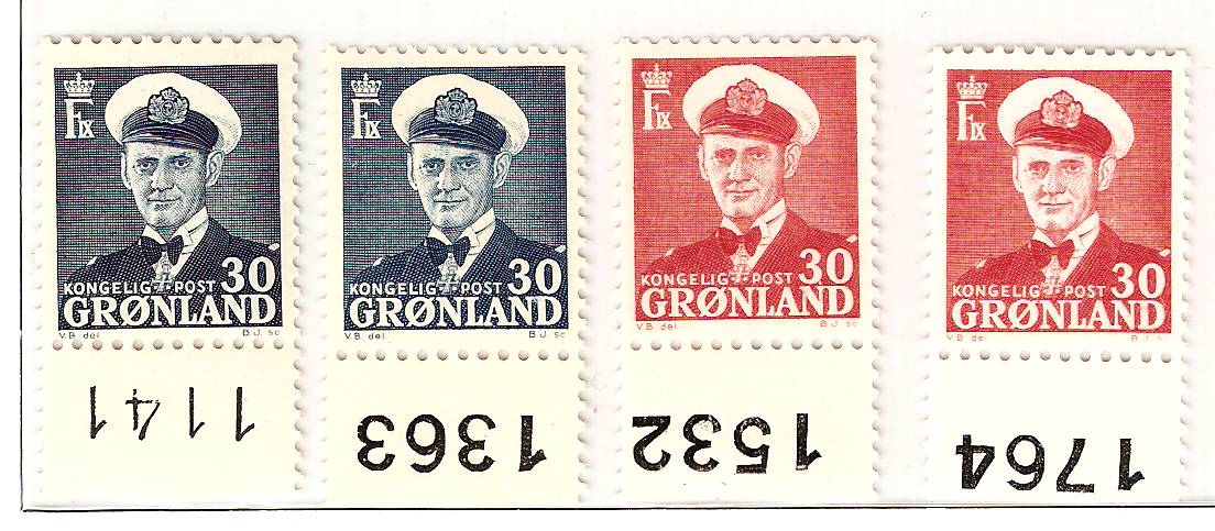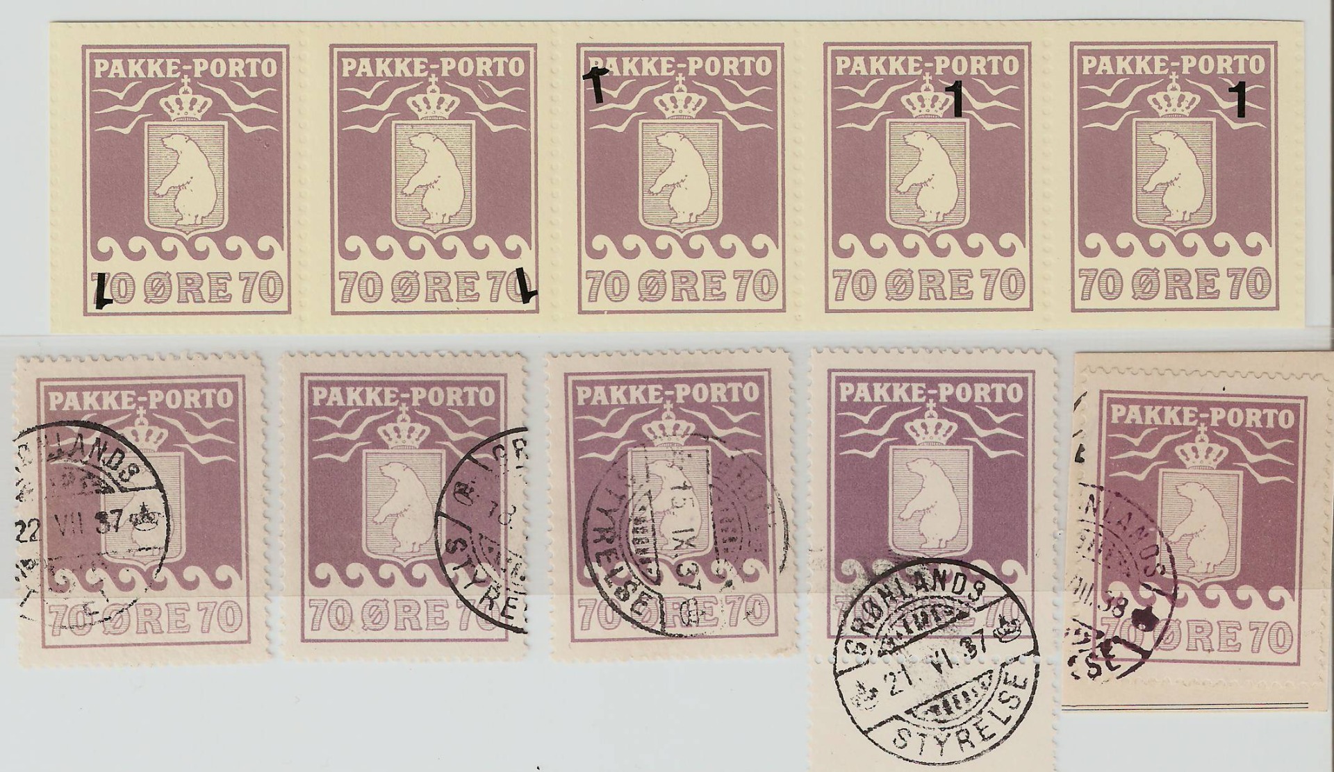 Offset fremstillingsprocessen har muliggjort delvis fastsættelse i arket idet der findes små ens kende-tegn i hver af de 5 søjler. Givetvis fremkommet ved lodret kopiering af mærker i hver søjle. Placering af de små kendetegn er vist på 5-stribe af 70øren.