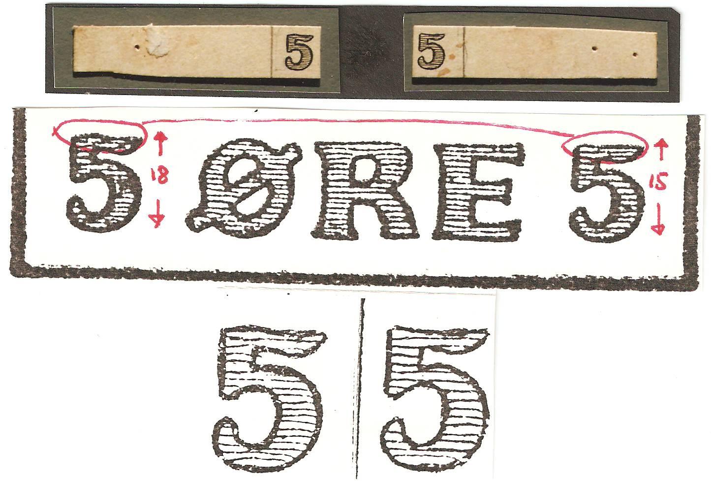 Overbevisende enkeltheder der kan ses på det trykte 5 øres pakkeportomærke.