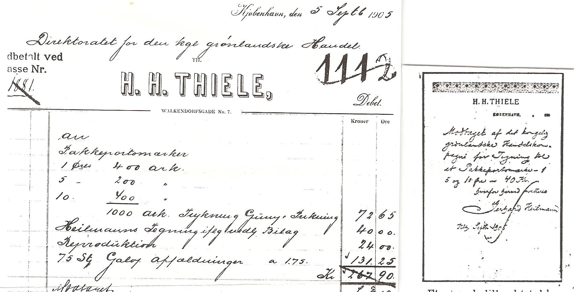 Fakturaen fra 1905 er bevaret på rigsarkivet tillige med kunstnerens kvittering.