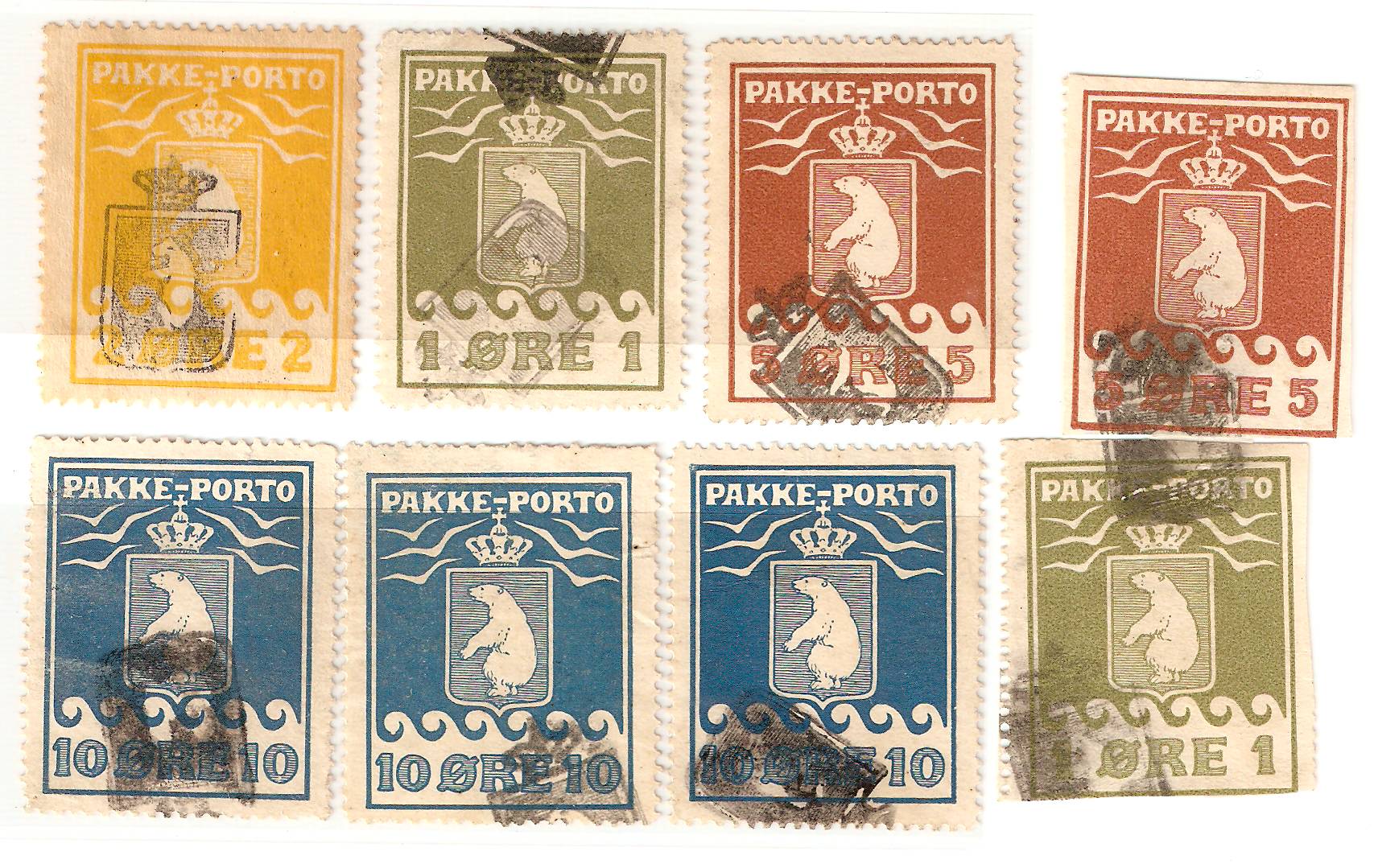 En modertegningen blev benyttet fotografisk til fremstillingen af pakkeportomærker 1905 til 1938 i omtrent 1 mill. eksemplarer og med 9 forskellige pålydende værdi. Klicheerne til 10 øres værdien kom i brug til trykning af 6 oplag, medens der til et senere oplag måtte fremstilles klicheer da de hidtidige var bortkommet. Schultz 1937-oplag har et særkendetegn, en farvet plet under skjoldet. Det samlede oplag af 10 øre værdien blev på xxxx.