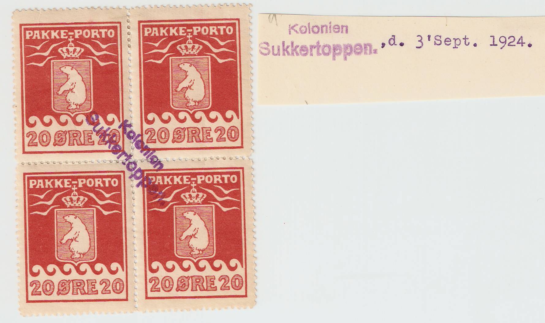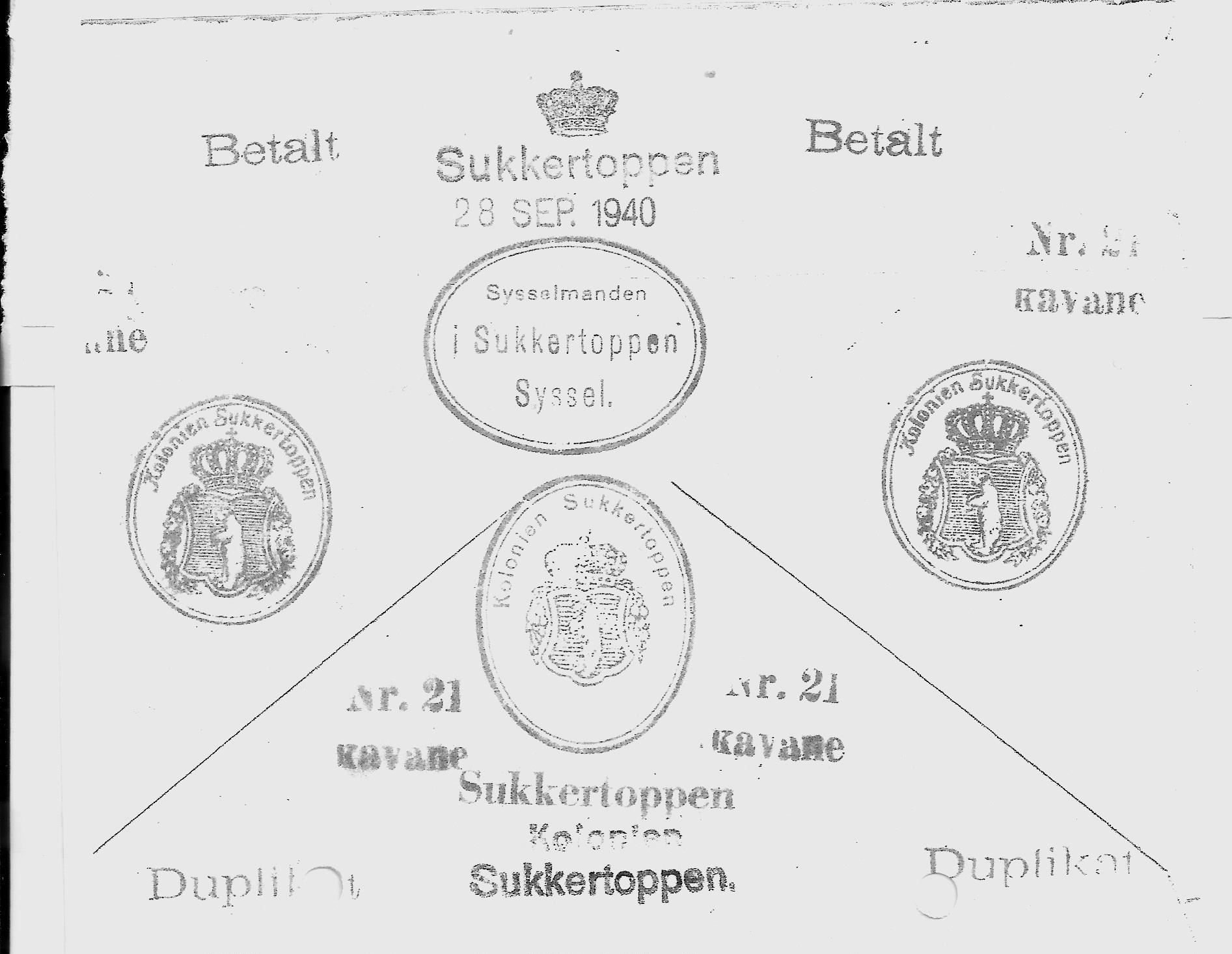 Kopi af Sukkertoppens stempler 1940. Et 1-linie stempel til pakke nummerering og R-breve: Sukkertoppen Kendt fra pakkeporto tiden er type 1A, 2 5a og 5b. Fiskale stempler type 2 kavane (avane i sydgrønland) desuden e´t par alm. kontorstempler Betalt og Duplikat.