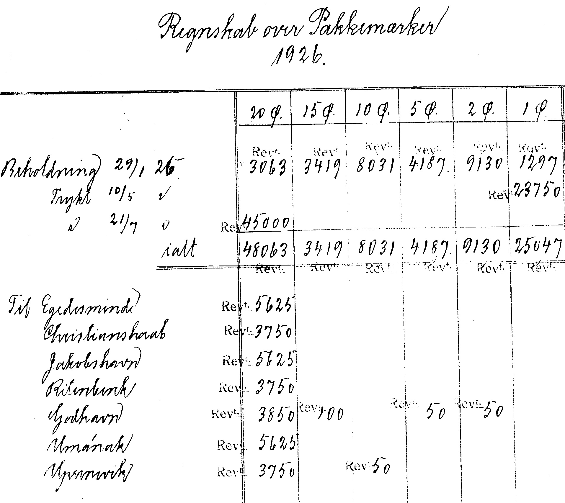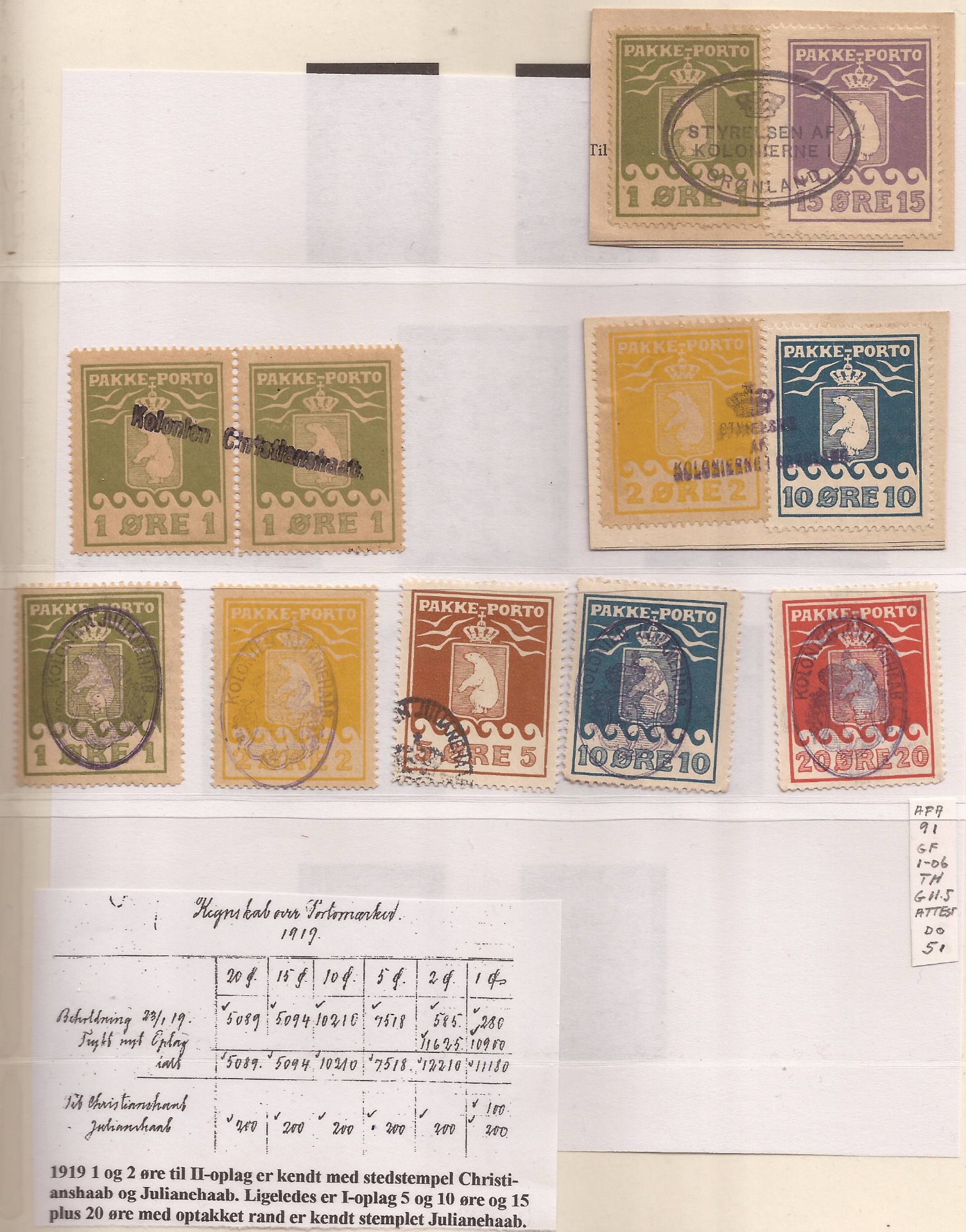 1919. Det årlige Regnskab over Portomærker, specifiserer distribution af pakkeporto. Christianshaab 4 ark 1 øre (givetvis 1919-oplag) og Julianehaab fik 8 ark af alle 6 værdier. (15 øre er hidtil ukendt med Julianehaab stempel.