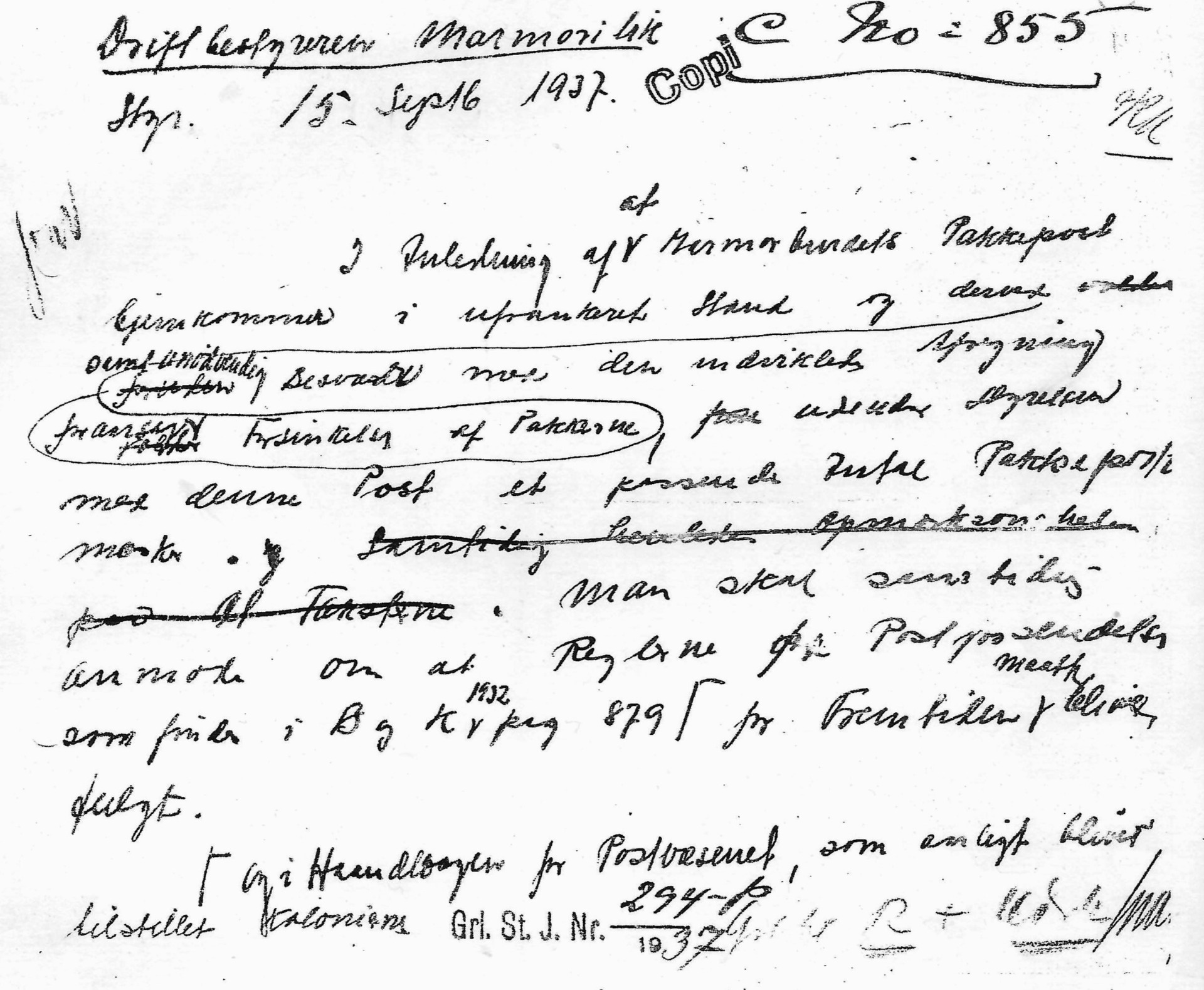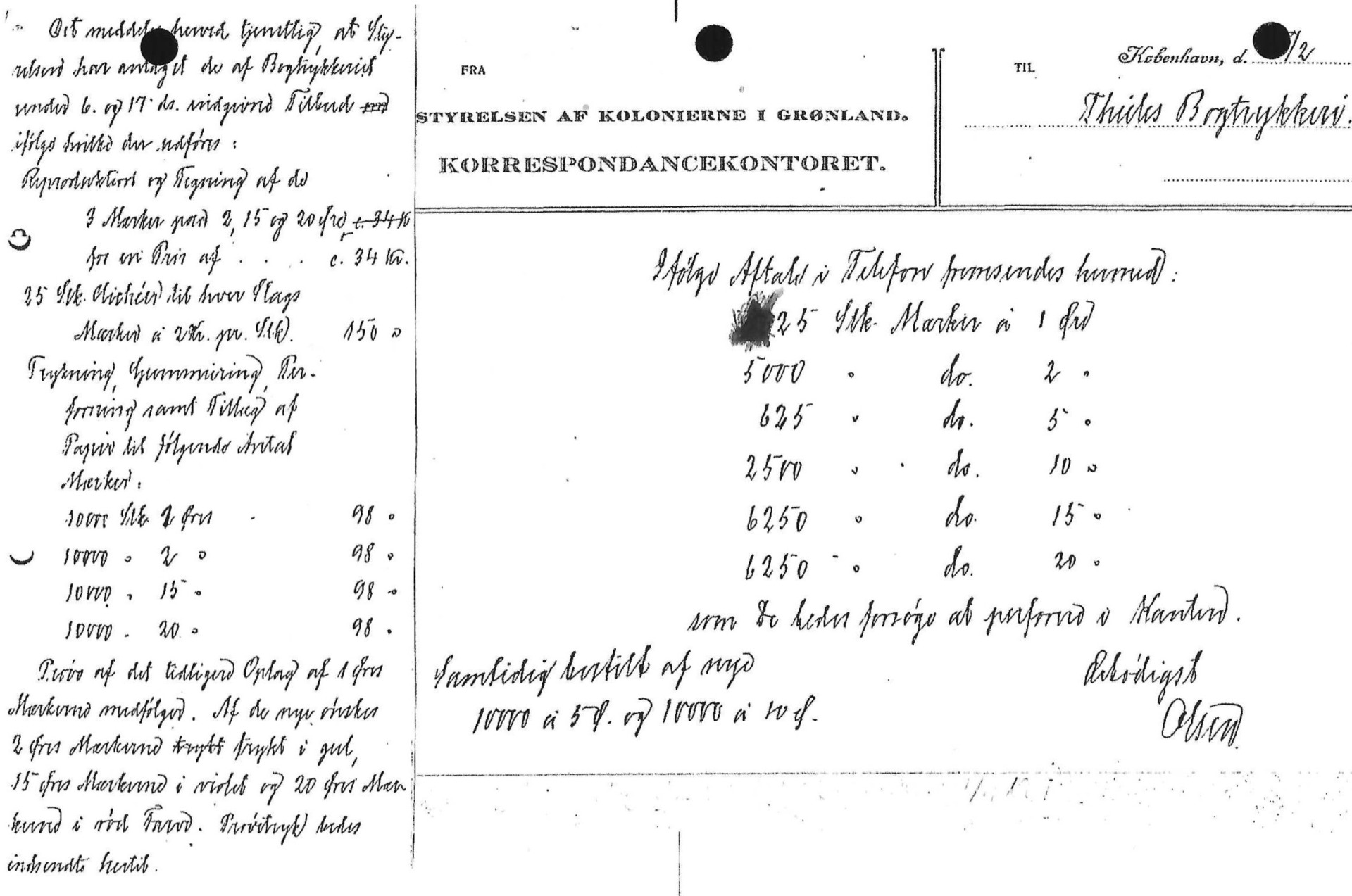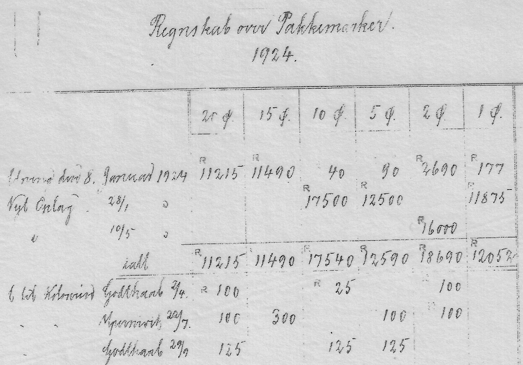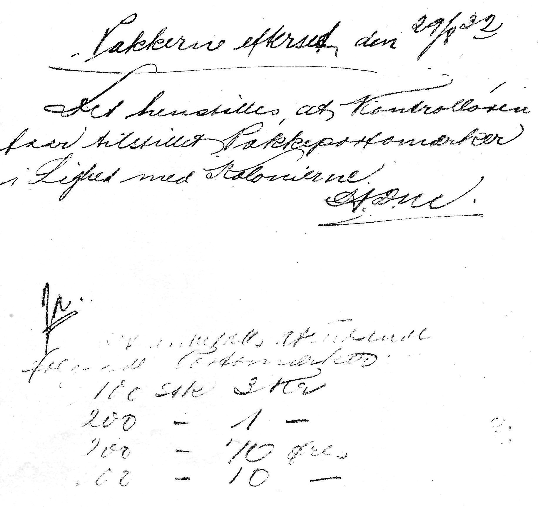 Tidligste pakkeporto oplag fastsættes til 10.000 styk af 10 og 1 øre værdien. 5 øre det halve antal. Distribueret antal til de enkelte poststeder og et ekstra antal til KGH's kontor i København.
