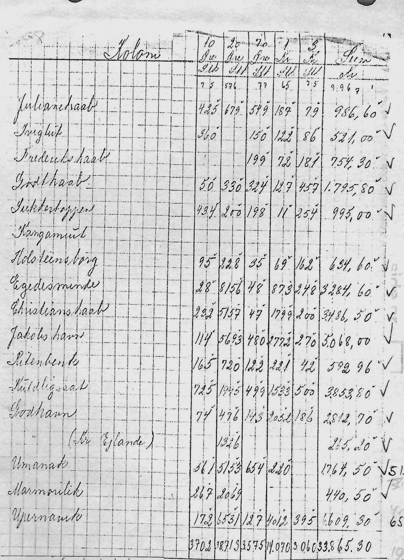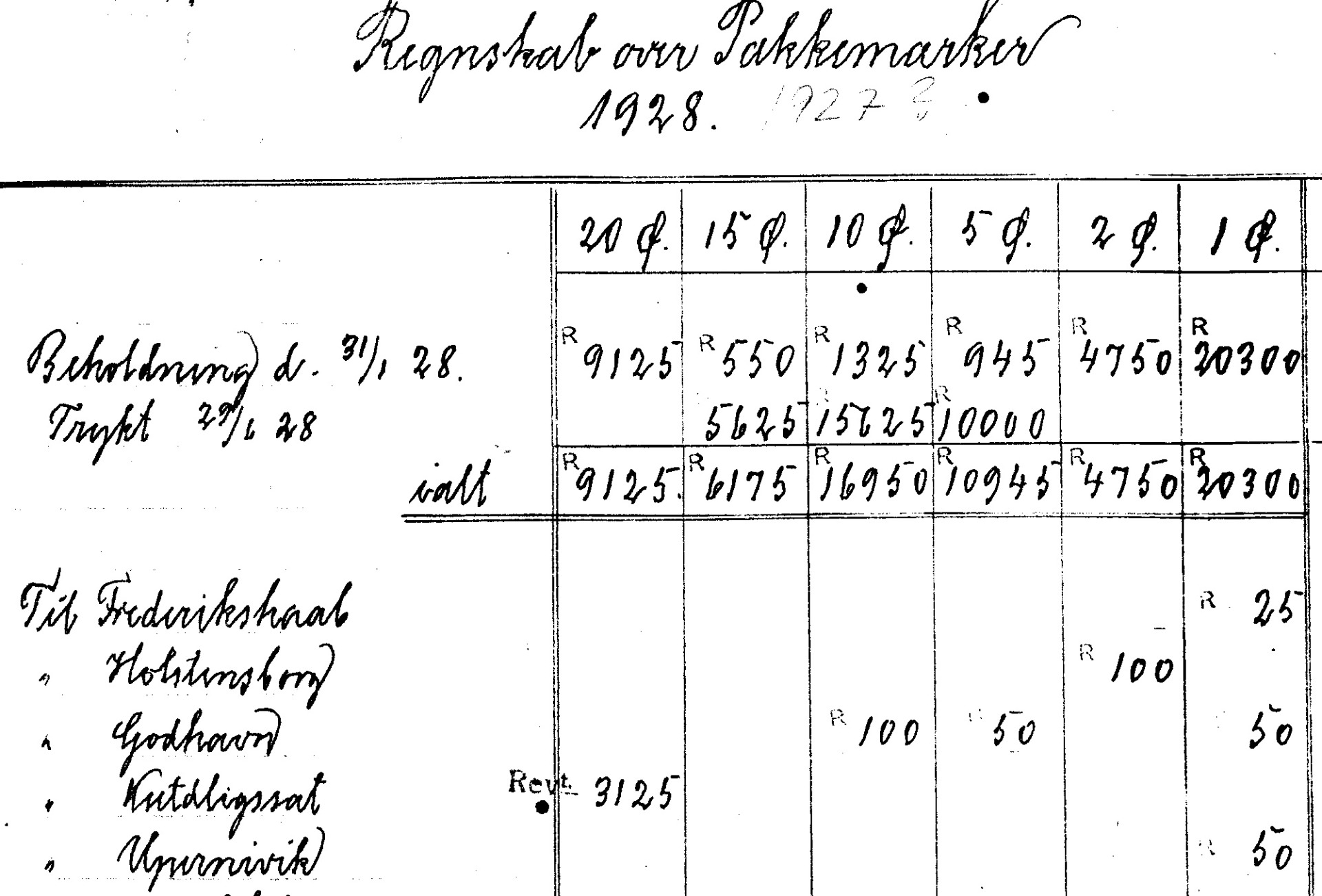 Kolonien Frederikshaab tildeles 100 styk og sam-me antal til det underlagte poststed Ivigtut. De årlige regnskaber 1917-1931 er skannet, bort-set 1927 der savnes på rigsarkivet.