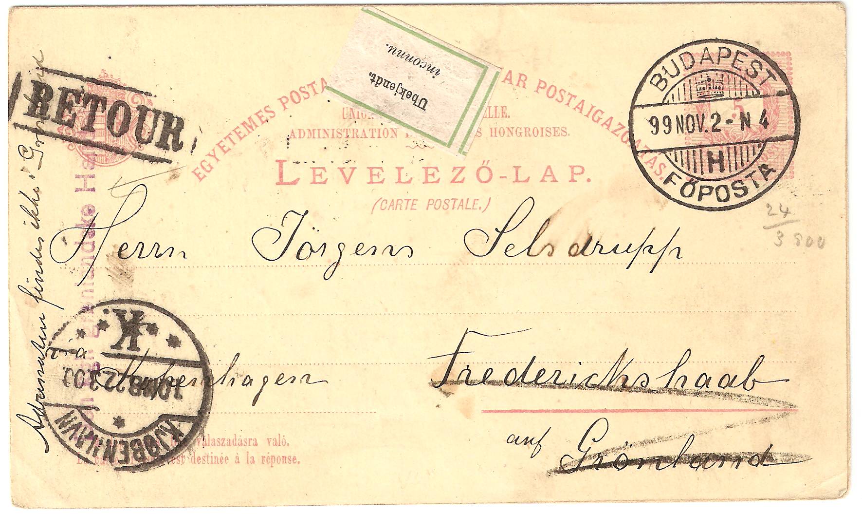 KGH har en befolkningsoversigt så besøg skulle være unødvendigt besvær. Bemærk endvidere kortets dato. Dato fra Budapest 2.november, ankomst og afgangdag 22.marts fra Køben-havn. Det kunne tyde på at besvarerelsen først er sket efter KGH's forårsåbning.